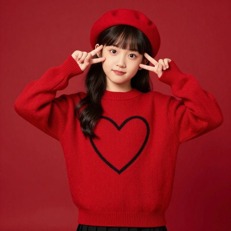This vibrant image showcases a young girl confidently posing against a bold red backdrop. She wears a stylish red sweater with a heart design and a matching beret, perfectly complementing her playful look.