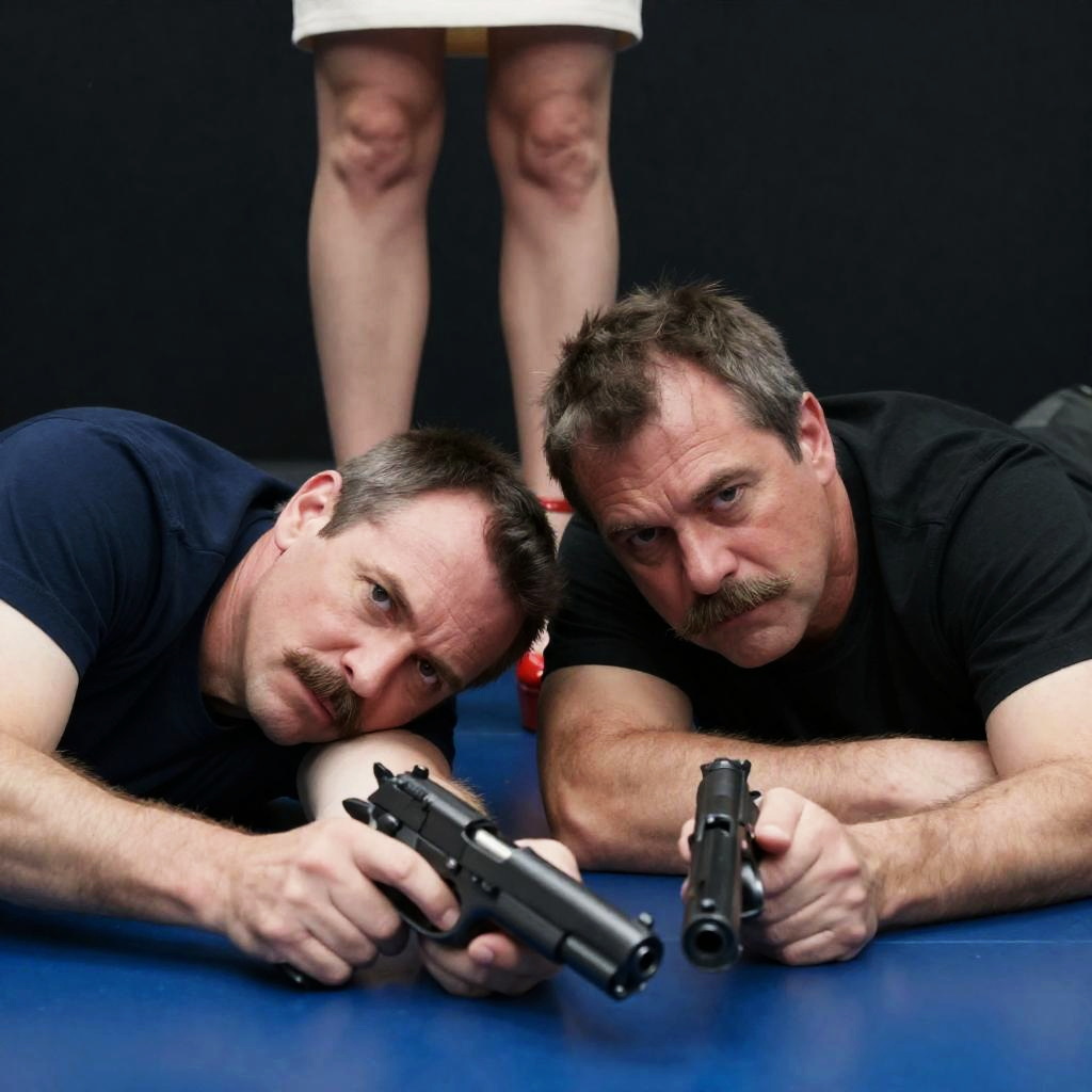 Photograph of two middle-aged men with mustaches lying on a blue surface, one holding a black gun, both with intense expressions. A woman in red high heels stands above them, her skirt partially visible. Background is dark.