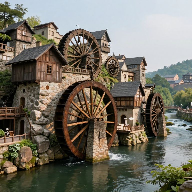 A fantastical cityscape featuring multiple water wheels of various sizes along a riverbank. The city is built on rocky terrain with a blend of wooden and stone buildings showcasing intricate architectural design. Prominent large wooden and metal water wheels are integrated into the structures, with a calm river flowing through the scene. Lush greenery surrounds the city under a soft blue sky, creating a serene and dreamlike atmosphere.