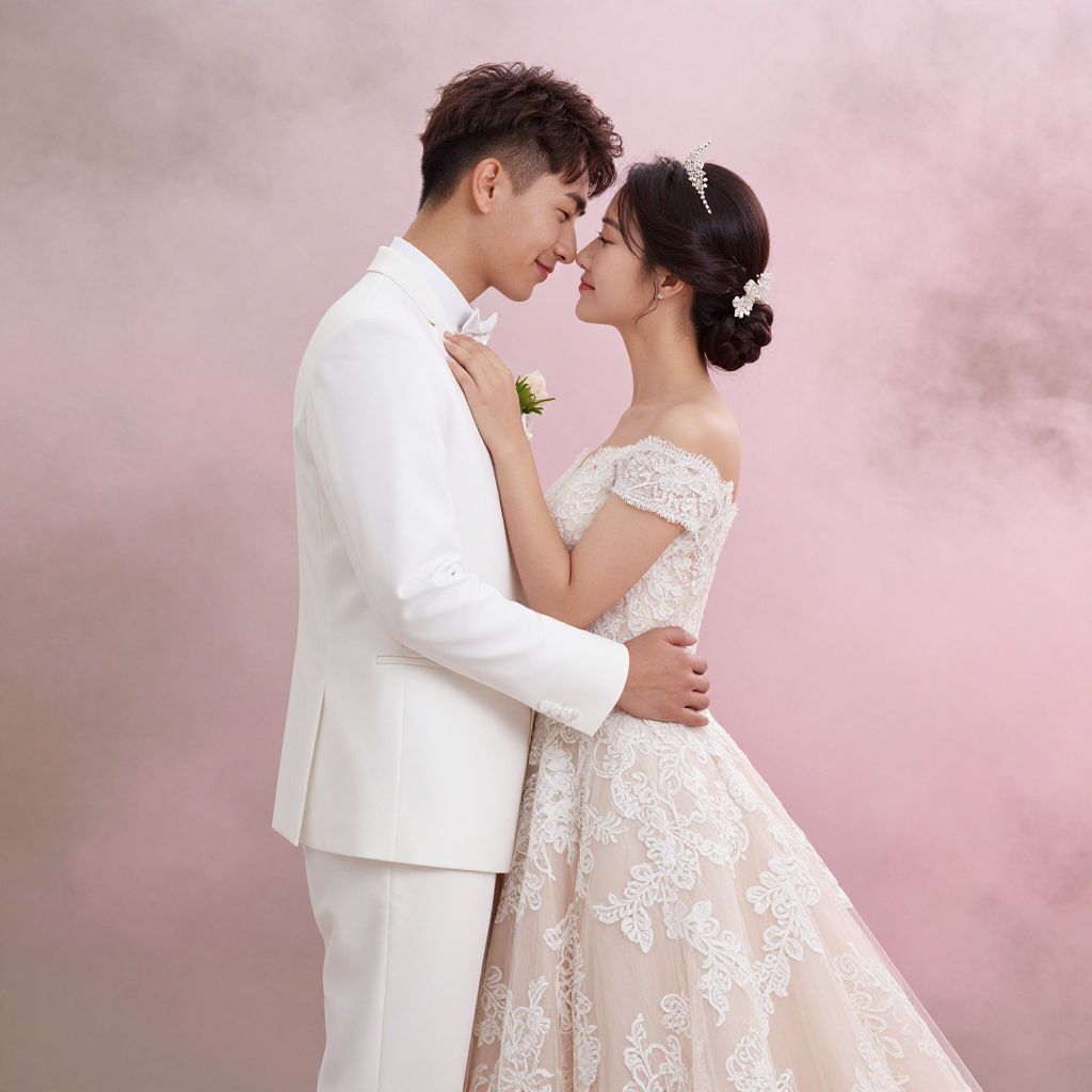 Photograph of an Asian couple in a romantic, outdoor setting with cherry blossom trees in the background. The woman, with long, wavy black hair adorned with small white flowers, wears an off-the-shoulder, white, ruffled wedding dress. She has fair skin and a delicate, slender build. The man, with short black hair, wears a light beige suit and white shirt, and has a lean physique with fair skin. They are gazing into each other's eyes, with the woman's hands gently holding the man's chest. Cherry blossoms frame the top of the image, creating a soft, romantic atmosphere. The background is blurred, emphasizing their intimate moment.