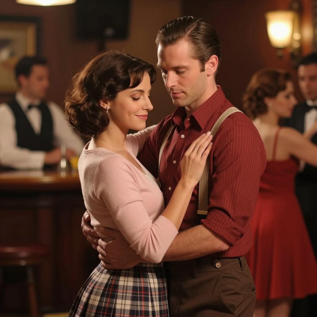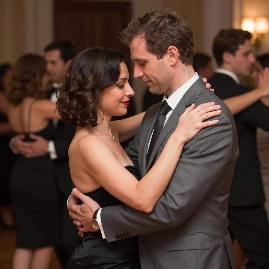 Couple dancing closely, man with short brown hair in gray suit, woman with dark bob haircut in black strapless dress, smiling, arms around each other. Background blurred, other dancers visible. Dim lighting, intimate atmosphere. 2 main people, 4 total.