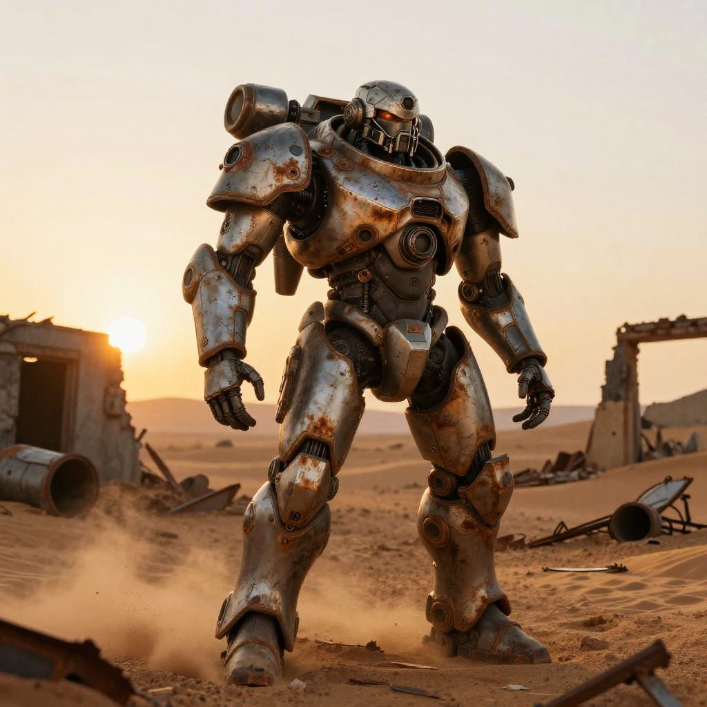 B-epon advanced mech warrior in a desert wasteland, rusted ruins of old technology scattered around, sunset casting warm orange glow, dust particles in the air, rugged battle-ready design, cinematic wide shot, highly detailed textures