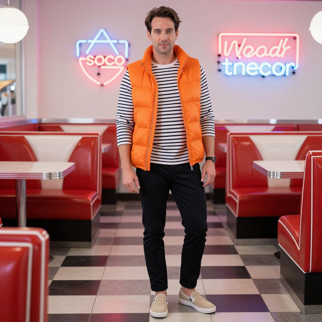 "a man, bright orange puffer vest, striped long-sleeve tee, tapered black chinos, beige slip-on canvas shoes, vintage diner, red vinyl booths, neon signs glowing, cinecolor, cheerful expression. Man has masculine face and piercing eyes"