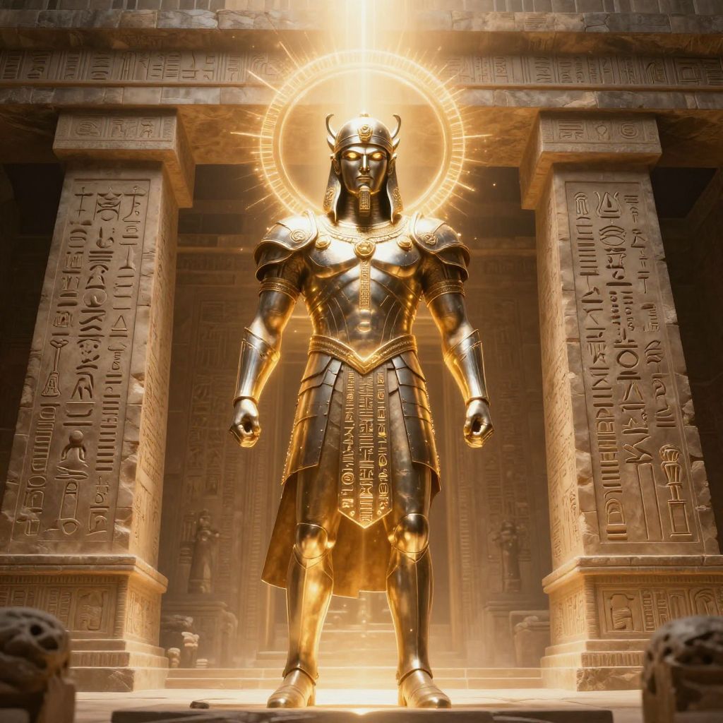 Golden, armor-clad pharaoh statue with a radiant halo, standing between ancient, hieroglyph-covered pillars in a dimly lit temple. (