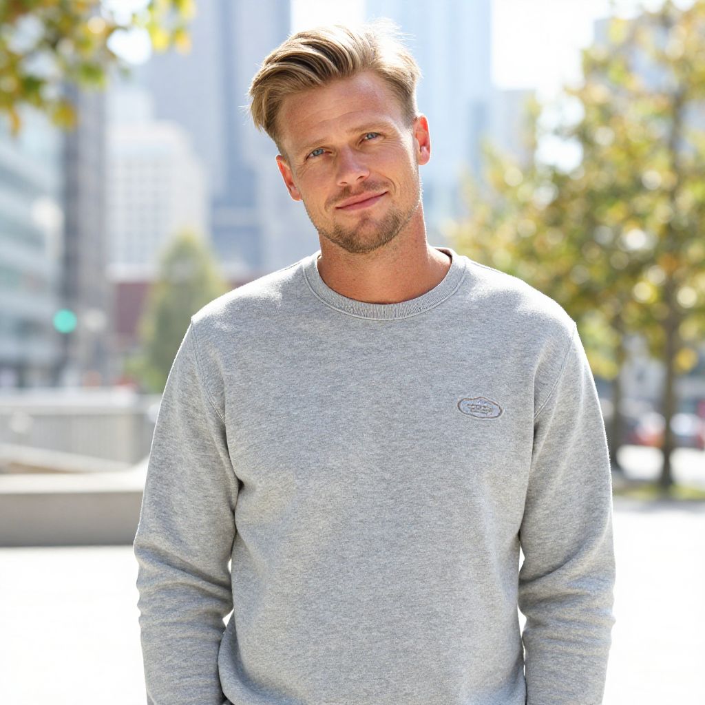 A man with soft blonde hair and bright blue eyes stands confidently in a modern, sunny urban setting, wearing a relaxed grey sweatshirt with a subtle vintage logo on the chest. He has a warm, friendly expression, slightly tilted head as if sharing a thoughtful moment with the viewer. The background features a city skyline with soft sunlight filtering through the trees, adding a natural, inviting atmosphere.