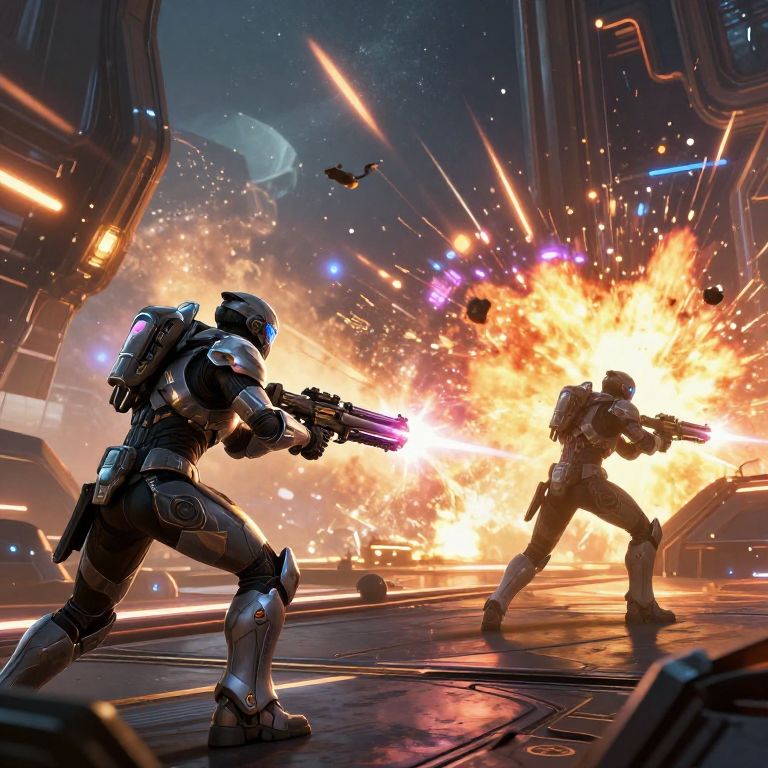Destiny 2 DPM concept art showing a futuristic battlefield with Guardians in sleek high-tech armor unleashing rapid-fire energy weapons, vibrant explosions illuminating a space warzone, dynamic action, intense combat atmosphere, sci-fi lighting effects
