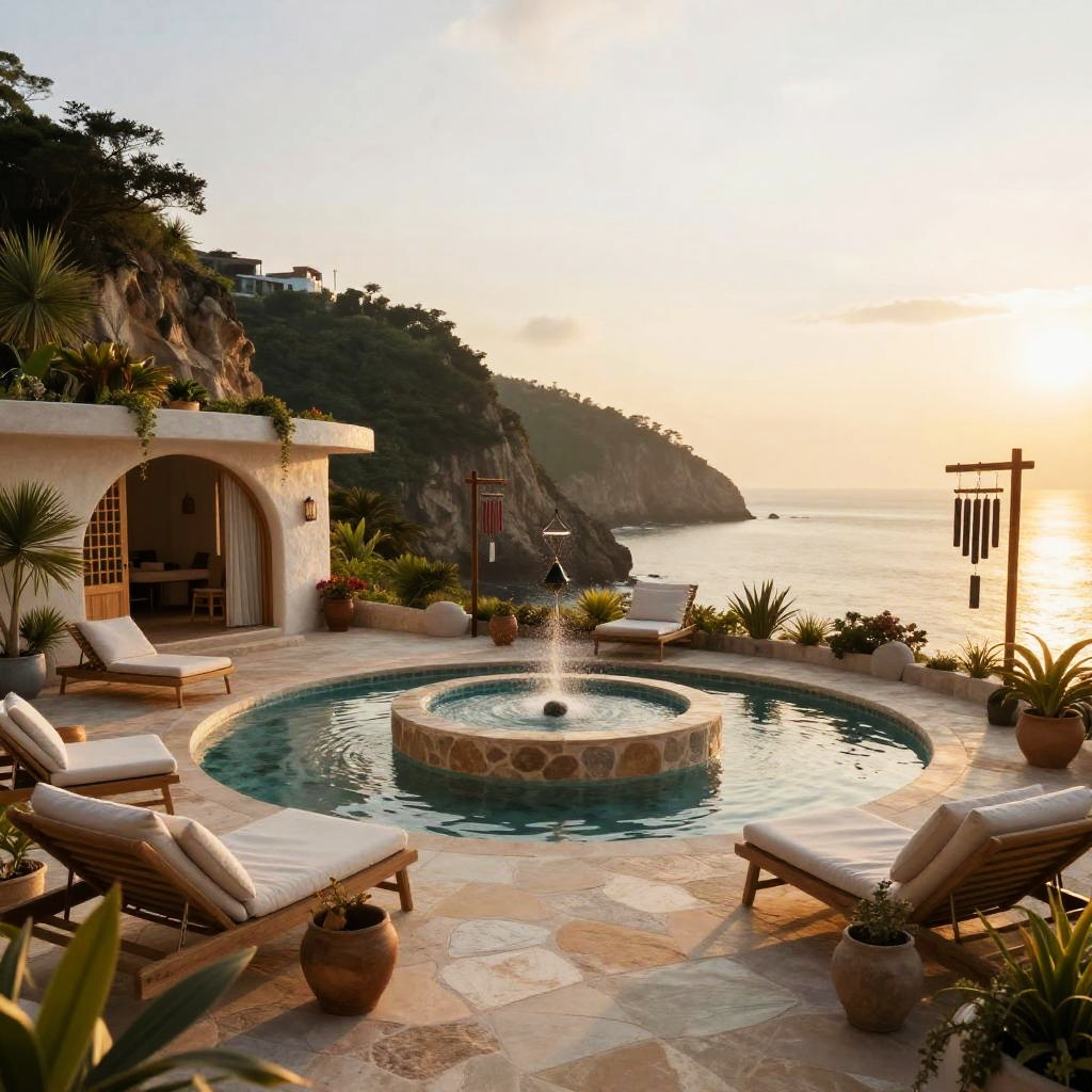 A healing sanctuary located in a tranquil seaside cliffs at golden hour, featuring a central open-air courtyard with tidal pools and wind chimes that promotes relaxation and well-being. The design incorporates natural elements and utilizes advanced technology for an ultra realistic experience in 4k resolution.