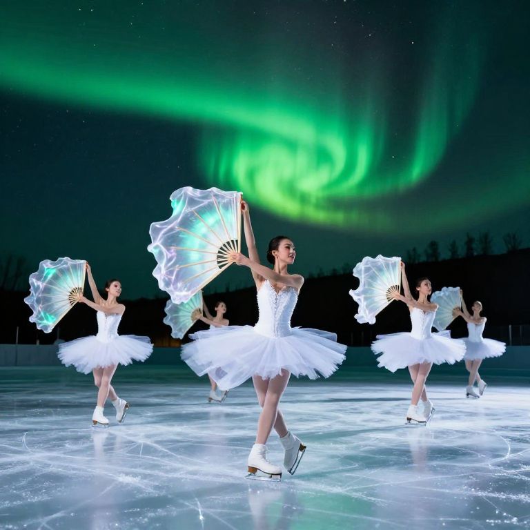 Dancers in flowing white tutus gracefully perform on a shimmering ice surface, each holding translucent fans that ripple with light, as a vibrant green aurora illuminates the night sky above them.