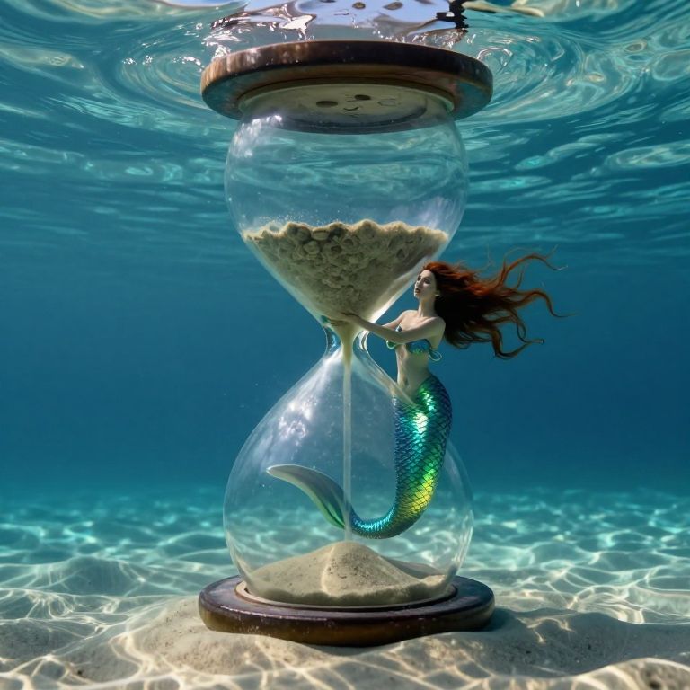 Craft an enchanting digital artwork with surreal elements reminiscent of Dali's dreamlike visions. Depict a tranquil underwater scene where a colossal hourglass, its glass distorted and warped like melting wax, hovers at the center. This enigmatic hourglass is seemingly held by a mystical mermaid princess whose hair blends into the shifting sands within. Viewers are invited to explore this captivating world through an unconventional 'bug's-eye view', revealing mesmerizing reflections on her iridescent scales and the intricate dance of light filtering through the water. This evocative image harmoniously combines surrealism with enchantment, transporting observers into a realm where dreams and reality converge.