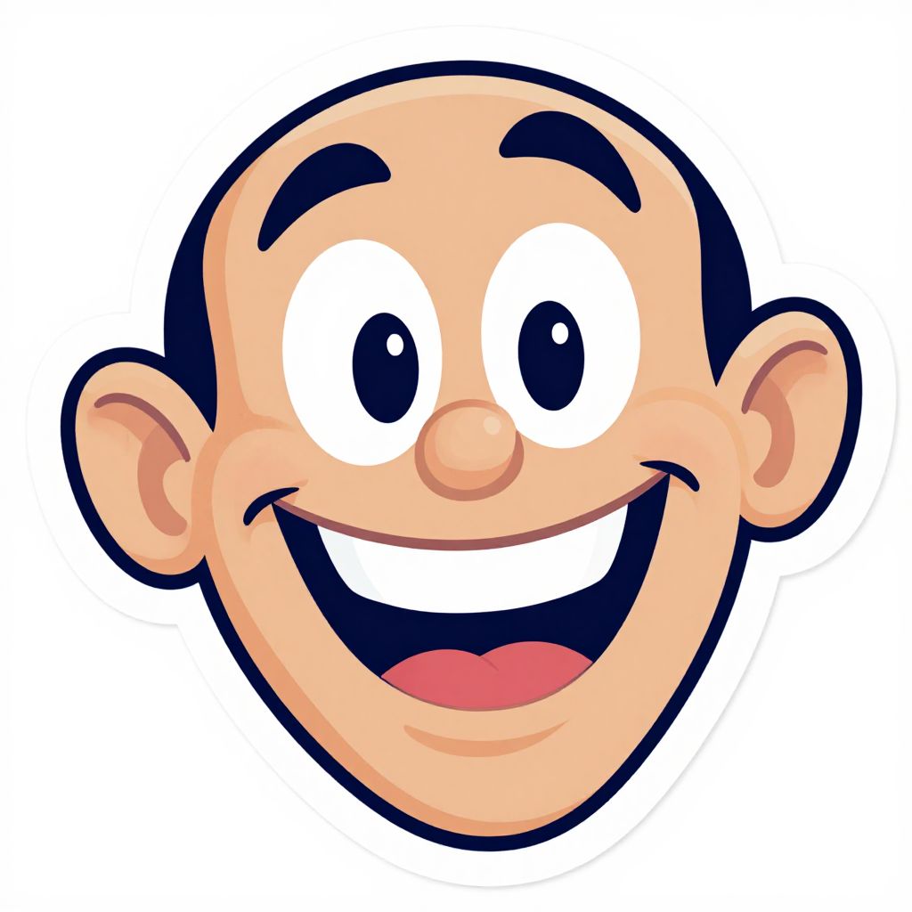 Cartoon-style illustration of a smiling bald man with large, expressive eyes, black eyebrows, and a wide open mouth. Bright, cheerful colors.