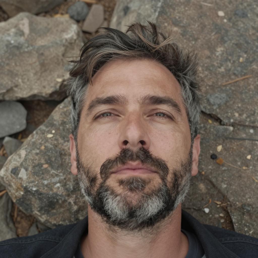 Photograph of a bearded man with brown hair, looking serious, wearing a dark shirt, against a ured, cloud-filled sky. Lower angle shot, focusing on his face and upper body. Sky fills the background. Single person.