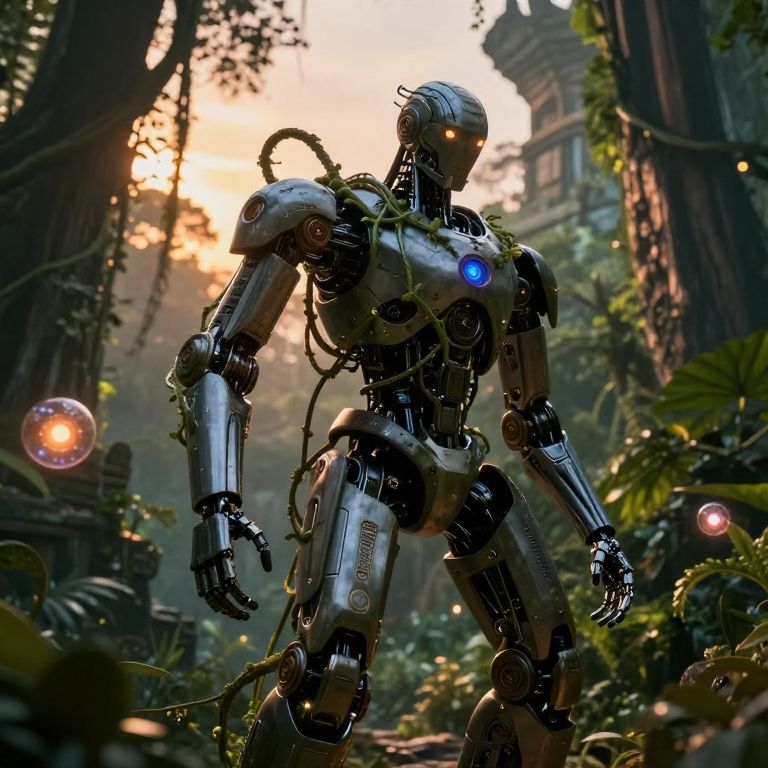 Photorealistic CGI of a shiny, silver humanoid robot with glowing orange eyes, standing in a futuristic, industrial, metallic cityscape.