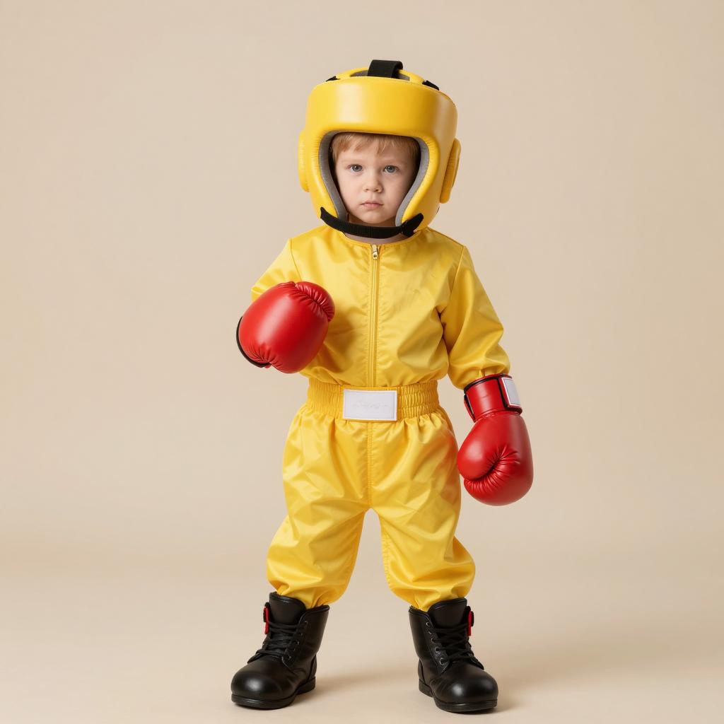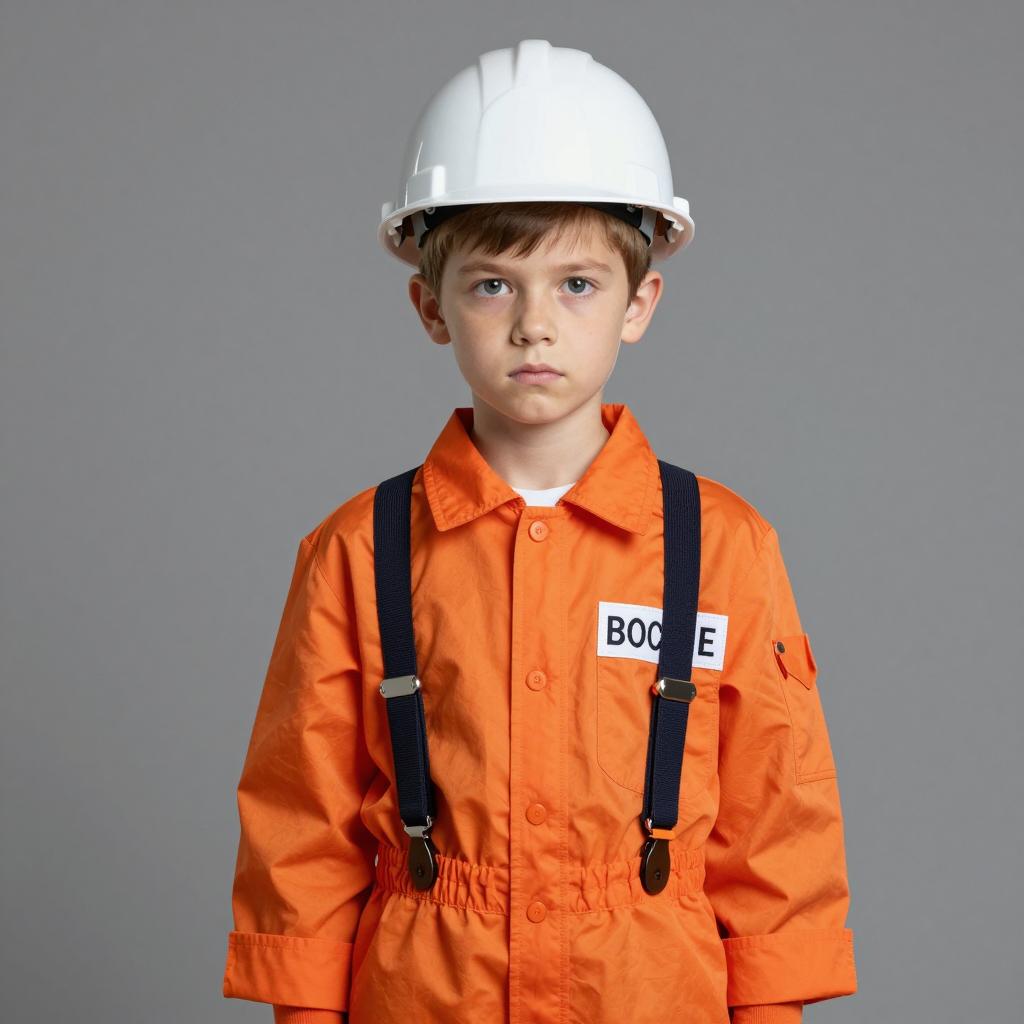 Boy work out costume, photorealistic, young boy, wearing orange prison jumpsuit, white hard hat, black suspenders, orange wristbands, serious expression, gray background, standing, front view, short brown hair, neutral lighting, studio shot, realistic ures, detailed clothing, digital art, realistic style, portrait, upper body focus