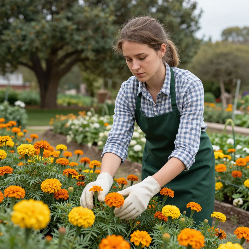 Woman tending vibrant marigolds in a lush garden, wearing a checkered shirt and green apron, surrounded by colorful blooms and trees in the background.