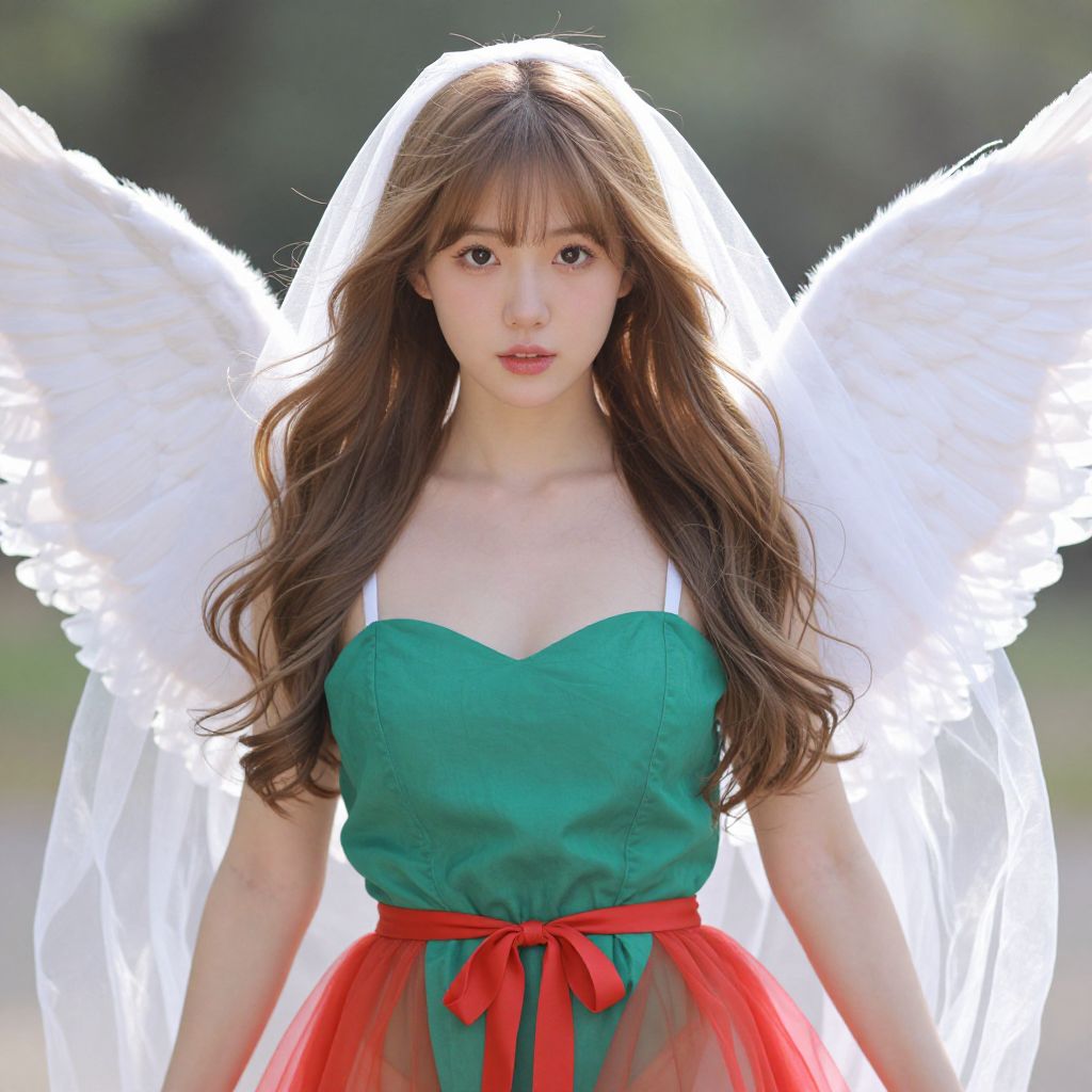 A beautiful young woman with long flowing hair, angel wings delicately placed on her head, wearing a vibrant green and red dress with a white veil and a red ribbon around her waist. She has a serene and graceful expression, exuding innocence and purity. Her features are soft and youthful, with big tits and a sexy aura that adds a touch of allure to her angelic appearance. The scene is set in a peaceful, ethereal environment, emphasizing her magical and divine presence.
