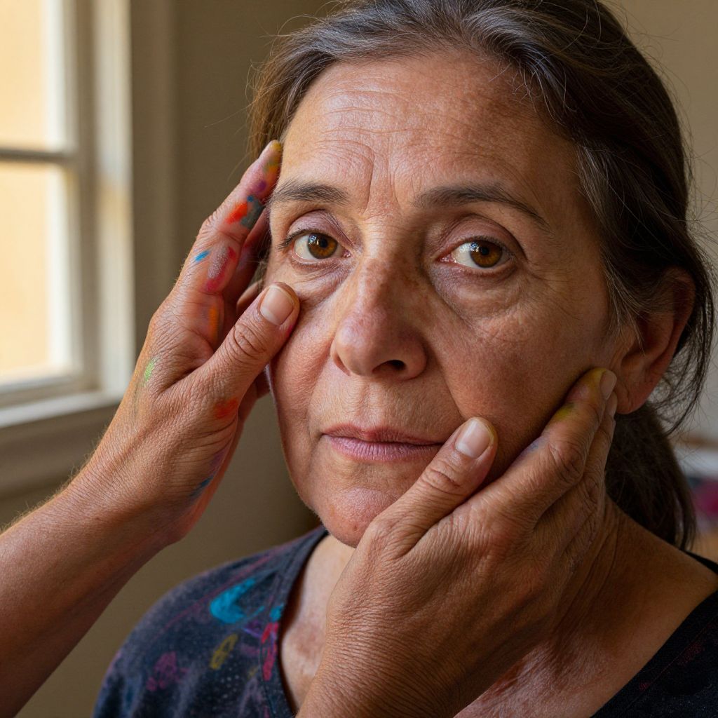 A DSLR portrait captures an artist's hands gently caressing the face of an older woman with deep, warm brown eyes and a life of stories etched into her skin. The vibrant hues on the artist's hands contrast beautifully with subtle lines on the subject's face as they paint, creating a mesmerizing fusion between creator and creation. Abstract brushstrokes in bold colors seamlessly blend with her skin tones while soft golden light filters through a nearby window, casting gentle shadows that highlight the intricate interplay of colors and textures. This image embodies the harmonious connection between artist and muse, inviting viewers to contemplate shared experiences that unite us all.