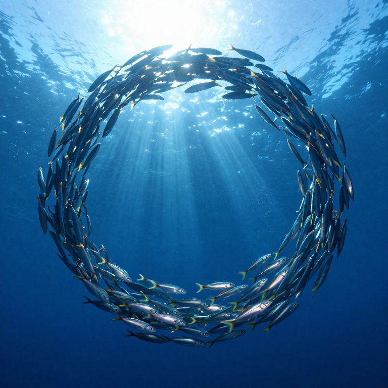 A mesmerizing school of fish forms a perfect circular ring underwater, their translucent bodies illuminated by sunbeams piercing through the deep blue ocean, creating a serene and ethereal scene.