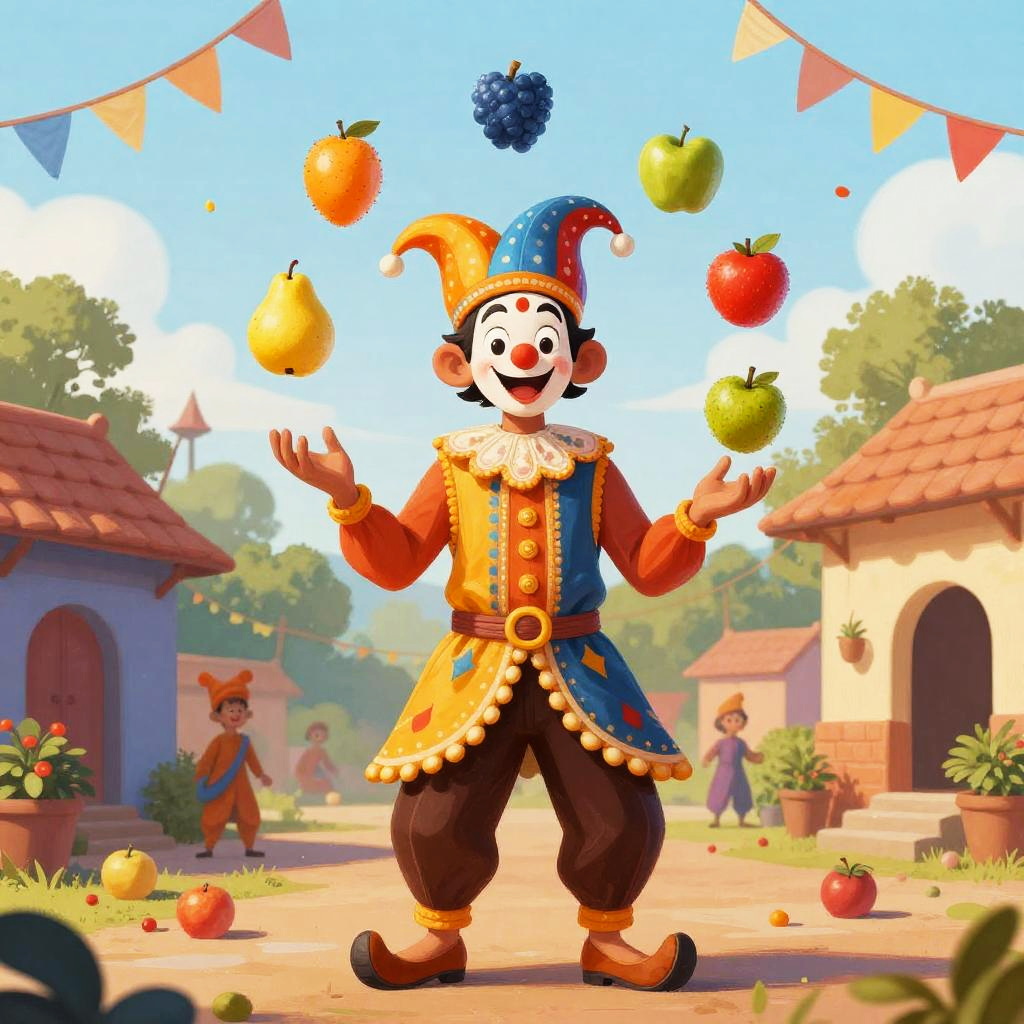 A goofy Indian jester juggling colorful fruits in a festive village setting, bright and cheerful atmosphere, intricate patterns on clothes, whimsical art, vivid digital painting