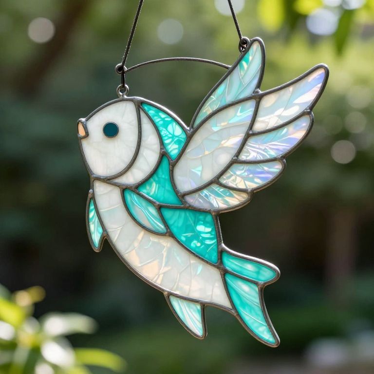 Iridescent stained glass suncatcher featuring a vibrant angel fish design in white and turquoise hues, gracefully suspended against a lush outdoor backdrop of greenery and sunlight.