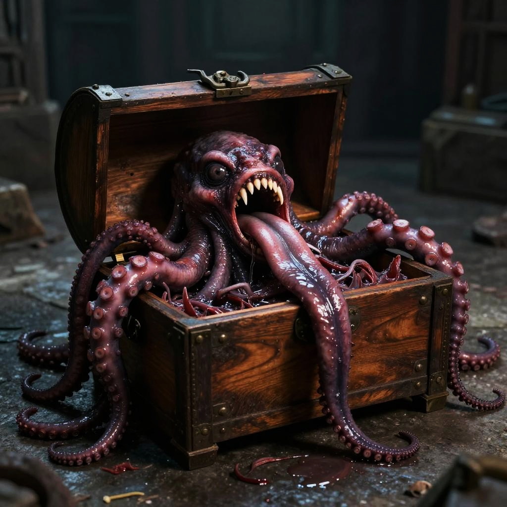 RAW photo, mimico, wooden chest, fleshy interior, long tongue, meat, saliva, TentacleHorrorAI, (sprawling tentacles), sharp teeth, stone floor, dungeon background, 8k uhd, dslr, cinematic lighting, high quality, photo realistic