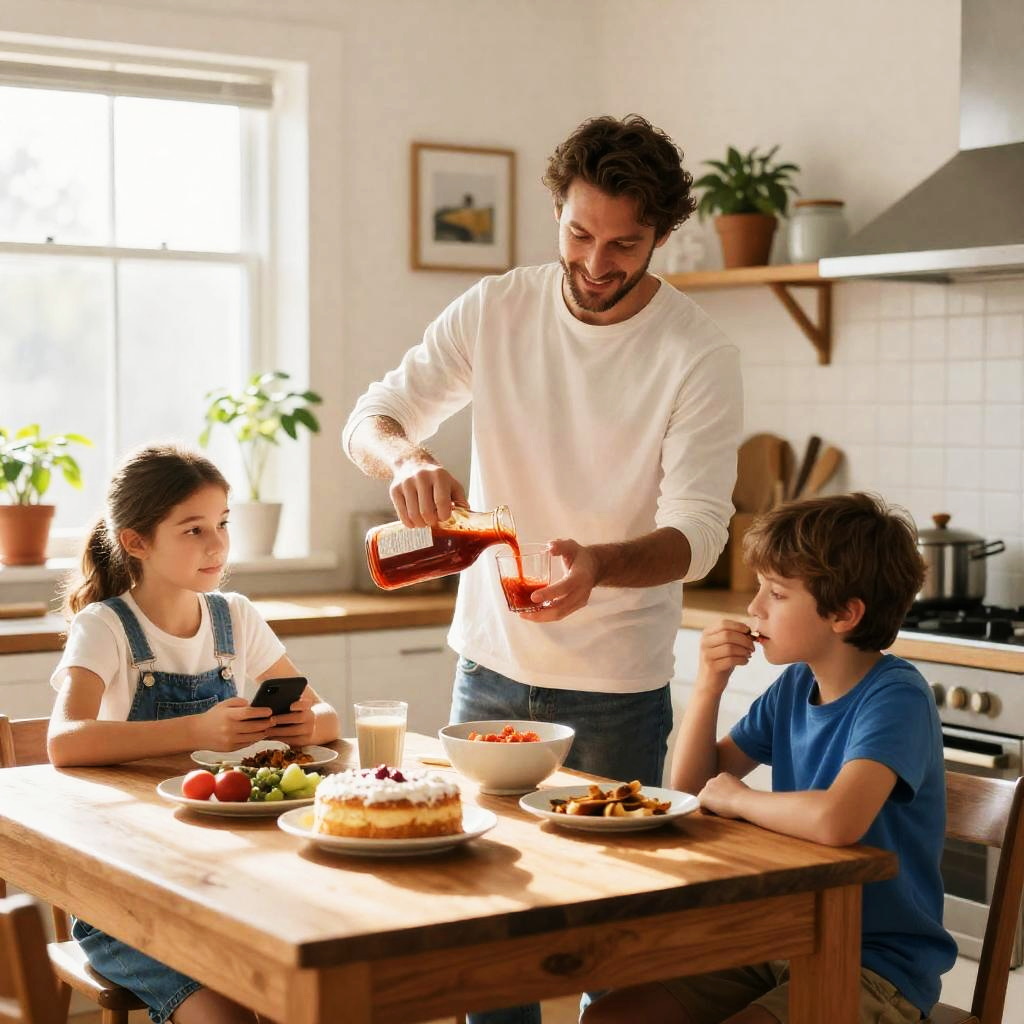 Photograph of a family meal. Man in black suit, white shirt, and tie eats while shaving at a wooden table. Young boy with short brown hair sits at the table, shirtless. Woman with brown hair, white blouse, and serious expression stands in the background. Table has bowl, cup, vase with pink flowers, apple, and pear. Kitchen in background. Framed picture on white wall.