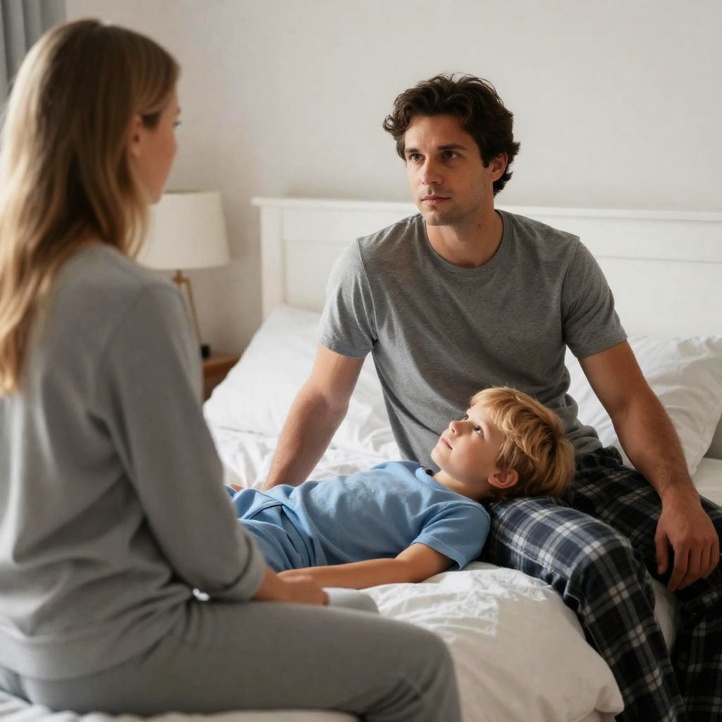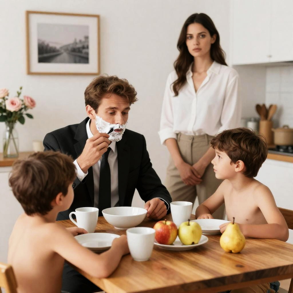 A man in a black suit and tie is shaving while sitting at a wooden breakfast table. Two shirtless young boys with short brown hair sit at the table facing the man. A woman with brown hair wearing a white blouse and beige pants stands in the background with a serious expression. On the table are white bowls, cups, a plate with apples and pears, and a vase with pink flowers. The setting appears to be a modern kitchen with a framed black and white picture on the wall.