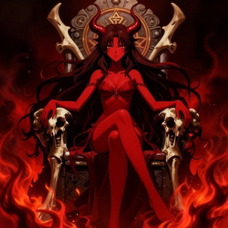 Digital anime-style illustration of a red-skinned demon woman with long black hair, red eyes, and black horns, sitting on a throne adorned with skulls and crossed bones. She wears a revealing, dark red dress, with her legs crossed and arms resting on the armrests. A glowing, ornate halo with a pentagram hovers behind her head. Fiery red and orange flames surround her feet. The dark, smoky background enhances the sinister and mystical atmosphere. Her expression is confident and slightly menacing.