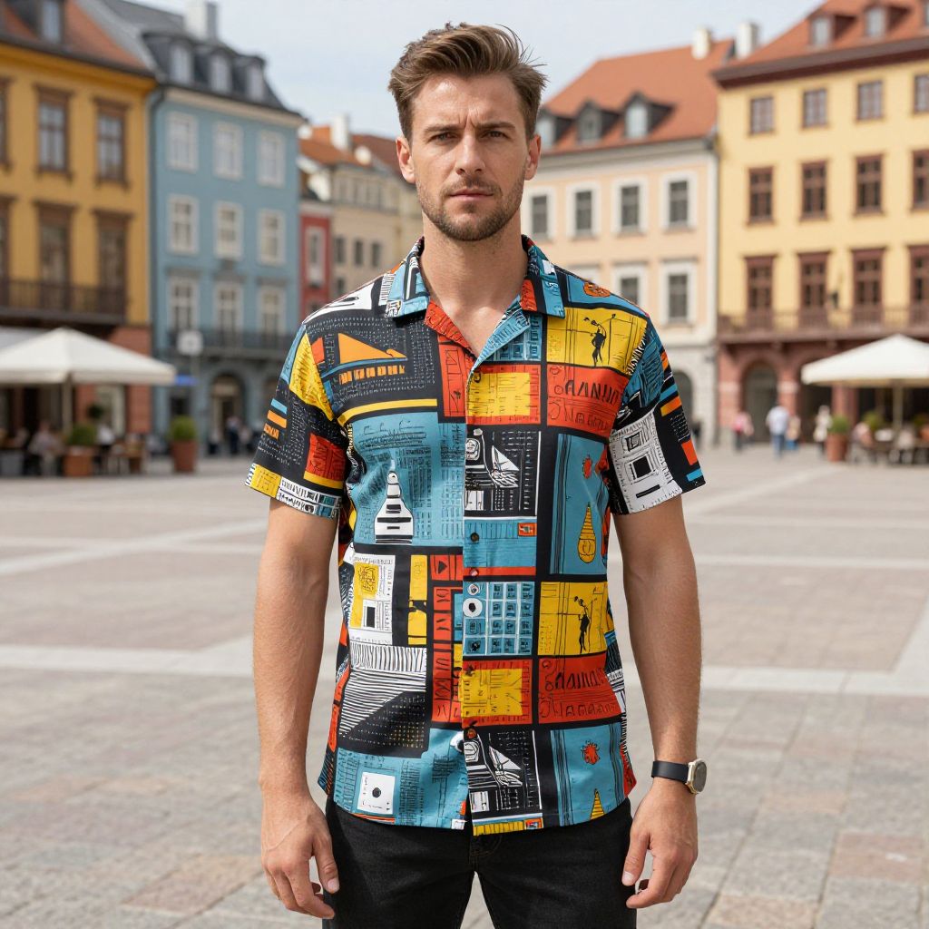Graphic sweatshirts styles, european man, A stylish European man wearing a vibrant graphic sweatshirt, showcasing bold design elements, relaxed posture, urban street scene background, natural lighting, high quality realistic photo, detailed textures, modern fashion, contemporary style