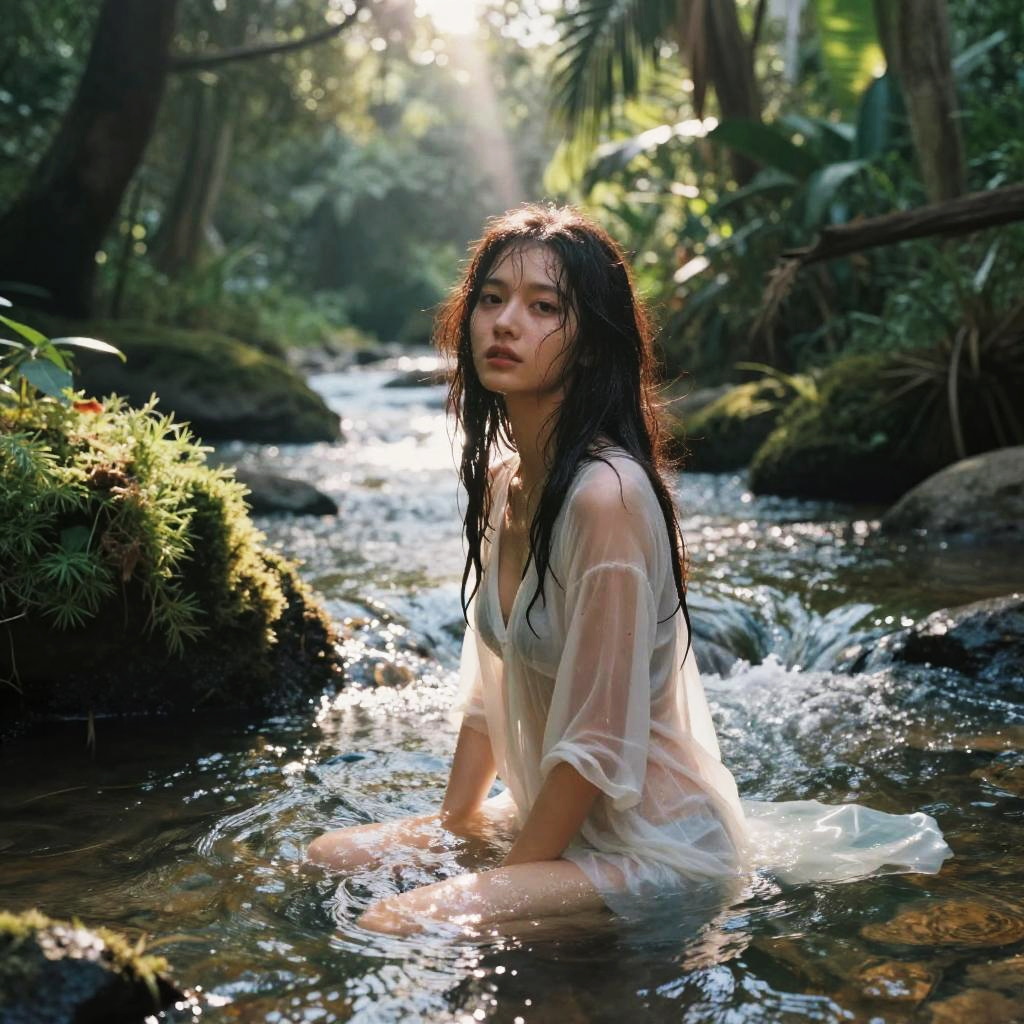 Photograph of an Asian woman with long, wet, dark hair kneeling in a sunlit forest stream. She wears a semi-transparent, white, wet shirt that clings to her slender frame, revealing the shape of her small breasts. Her expression is calm and slightly pensive. The stream flows around her, with sunlight filtering through the dense foliage, creating a serene, natural backdrop. Moss-covered rocks and lush greenery surround her, adding to the tranquil, untouched forest setting. The water glistens, reflecting the sunlight. The overall mood is peaceful and introspective.