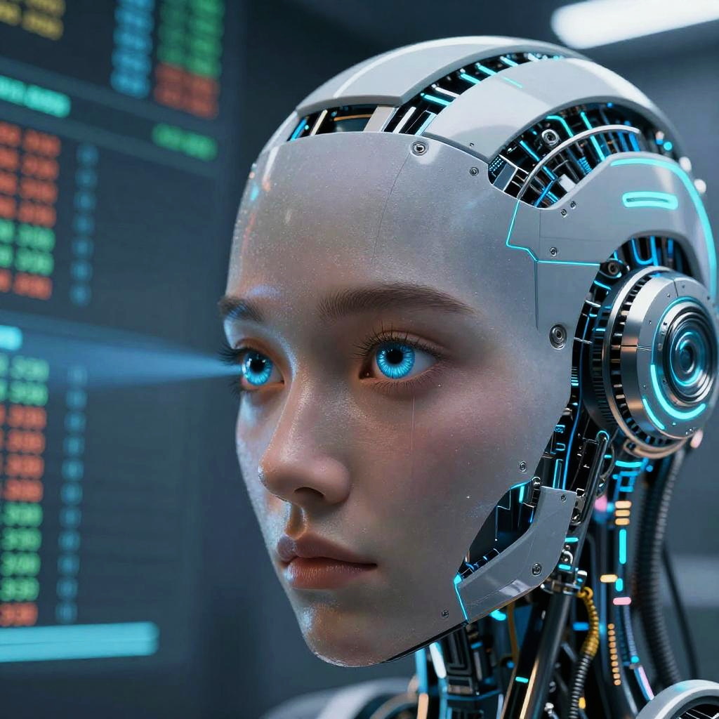 Photorealistic CGI of a cybernetic woman with a bald, robotic head, glowing blue circuits, and exposed mechanical neck, in a futuristic,