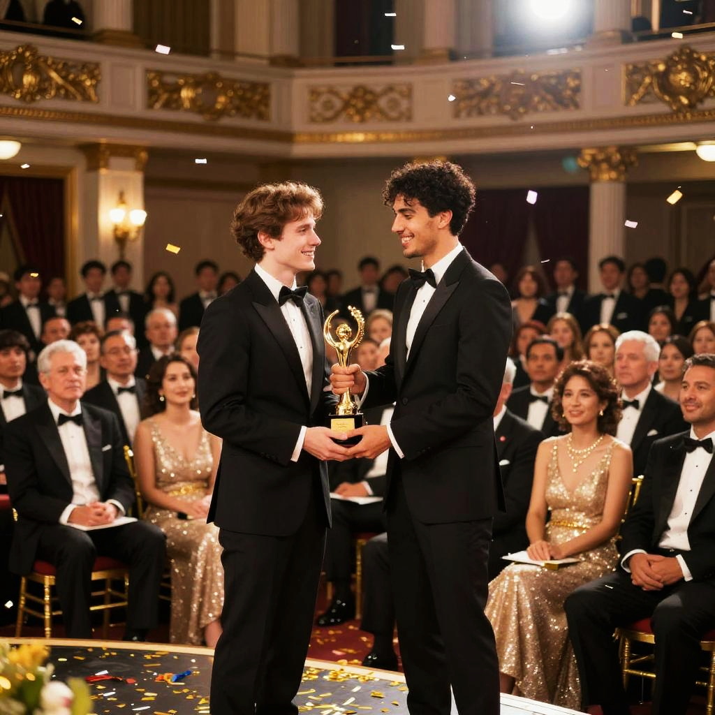 Awarding ceremony in a grand hall filled with elegant guests, a spotlight on the smiling winner receiving a golden trophy, vibrant confetti falling, detailed ornate decorations, warm lighting, expressions of joy and pride, cinematic style