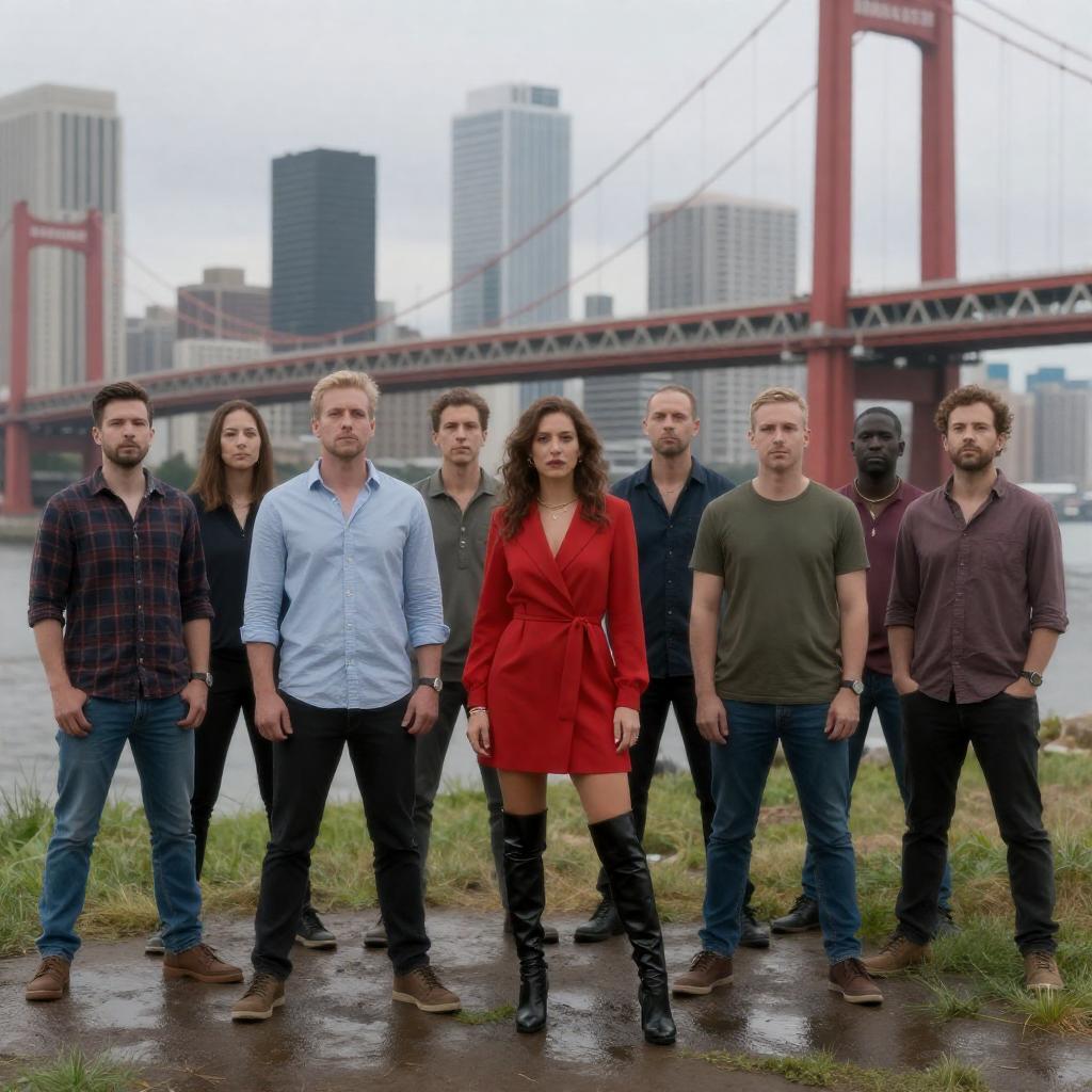 Photograph of two people standing in front of two framed band posters. Blond man in blue shirt, arm raised, smirking. Brown-haired woman in pink floral dress, holding guitar, smiling. Posters show men with guitars, one in purple light, one in blue light. Both posters feature intense, defined facial expressions. White wall background.