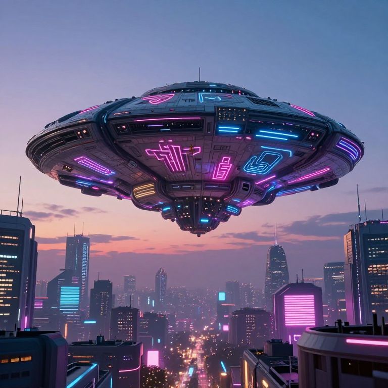 Alien ship art depicting a massive extraterrestrial spacecraft hovering over a futuristic cityscape at dusk, vibrant neon lights reflecting off metallic surfaces, intricate geometric patterns and glowing symbols on the ship, in a cyberpunk style.