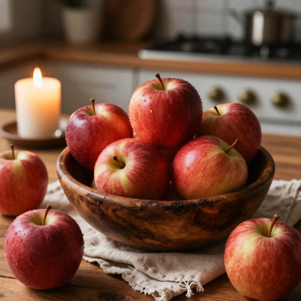 A red apple aesthetic blended into a cozy, vintage kitchen scene, where an aged wooden bowl overflows with shiny red apples surrounded by linen fabrics and warm candlelight, evoking nostalgia, comfort, and rustic charm.
