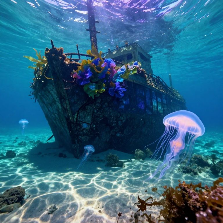Photograph of a sunken shipwreck adorned with colorful coral and seaweed, surrounded by two glowing jellyfish and illuminated underwater light patterns.