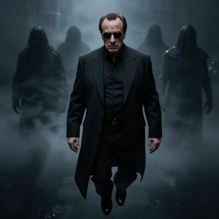 Tony Soprano the soul of a handsom, stern, middle aged knight floating in black fog. anguish. cold. wraiths looming in the background.,