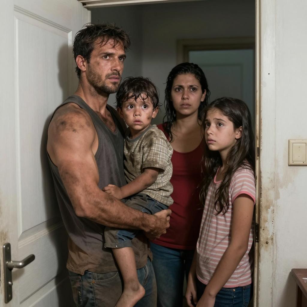 Three people in a dimly lit, tiled room. A nurse with short brown hair, wearing a white uniform, kneels beside a man with short gray hair, green shirt, and gray pants, who is holding a crying baby with dark hair. The man is sitting on the floor with his legs spread, surrounded by large, round objects. The nurse is attending to the baby, while the man looks at the camera with a concerned expression. Metal bed frame in the background.