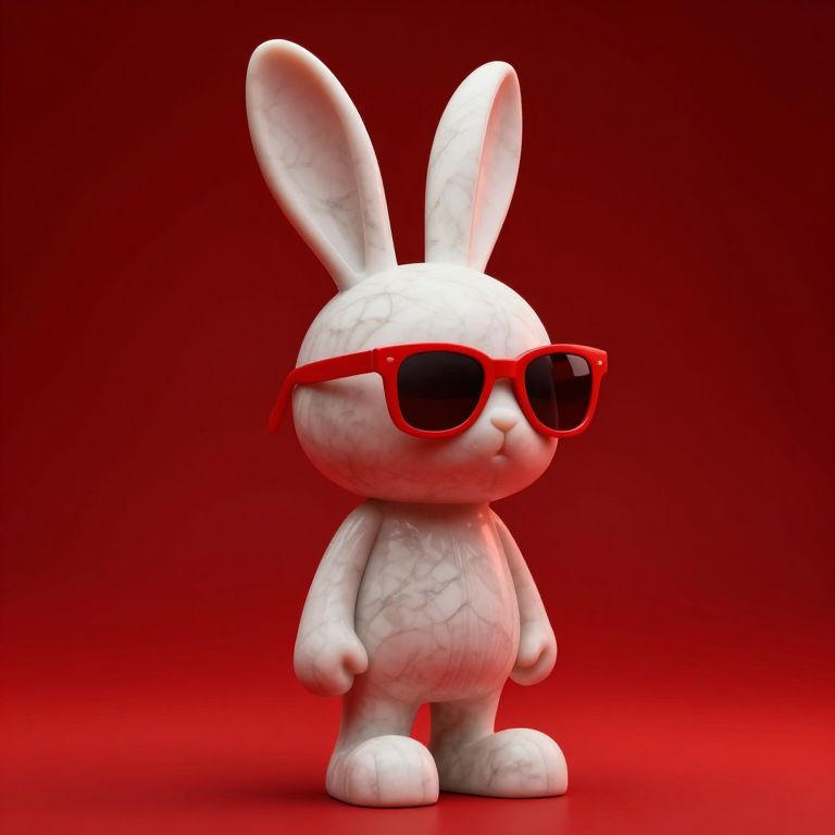 Digital 3D cartoon white rabbit with red sunglasses, standing against a solid red background, textured with subtle white veins.