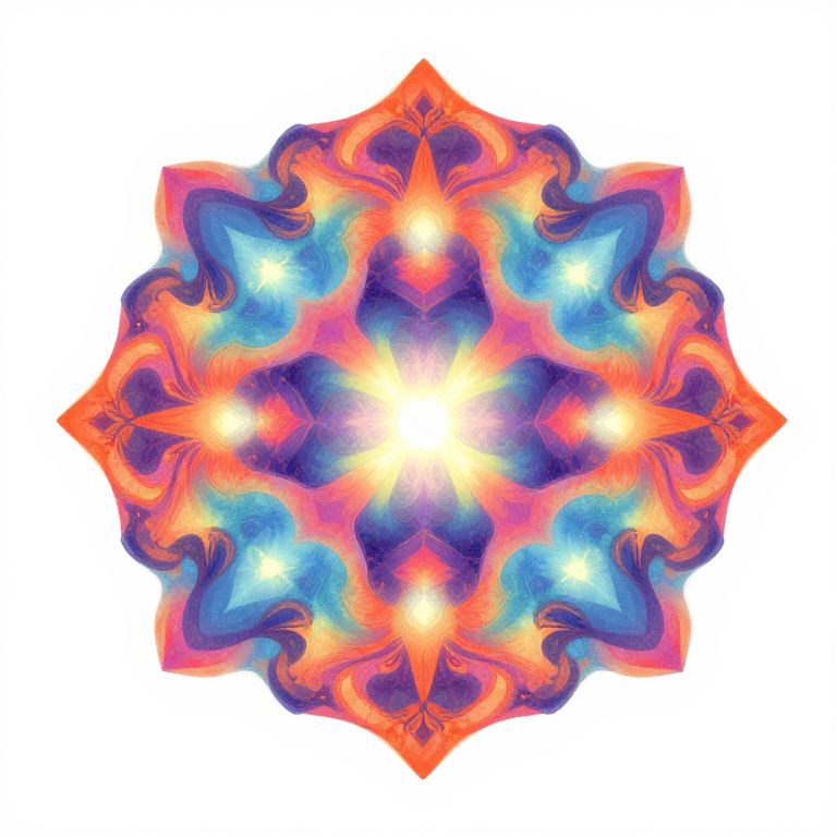 This digital artwork features a vibrant, symmetrical, kaleidoscopic pattern with a star-like shape. At the center, a bright, white, glowing core radiates outward, surrounded by swirling, flame-like shapes in vivid shades of red, orange, and pink. The outer edges transition into deep blues and purples, creating a dynamic contrast. The pattern repeats symmetrically, with each point of the star mirroring the others. The texture appears smooth and fluid, with a slightly glowing effect that gives it a three-dimensional, almost fiery appearance. The background is plain white, making the colorful pattern stand out prominently.