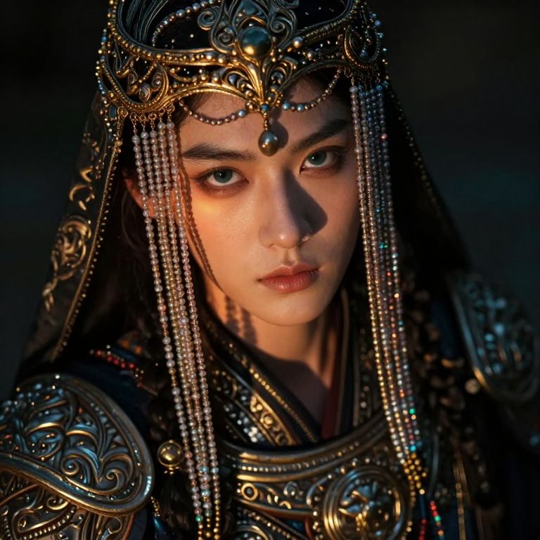 This is a highly detailed CGI digital artwork of an Asian woman with fair skin and long, flowing blue hair. She wears an elaborate golden crown adorned with red and blue gems, and her facial expression is calm and composed. Her eyes are almond-shaped and her makeup is subtle, enhancing her natural beauty. She is dressed in a luxurious blue and gold robe with intricate red and blue gem-encrusted shoulder armor. The background is blurred but features a dark, mystical setting with hints of metallic and ornate elements, adding to the fantasy-like atmosphere. The overall style is realistic with a fantasy art influence.