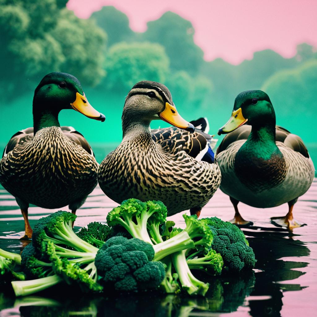 Three striped tabby cats and one gray cat, eating green broccoli, centered, with Cheiron Crush glam rock aesthetic, film photography style, soft focus, hyperrealistic detail, backlit lighting, bleached colors, 8k octane render.