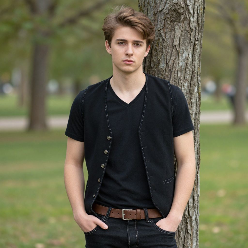 Photograph of a handsome young man with light brown hair, standing against a tree. He's wearing a black V-neck T-shirt, black sleeveless vest with white stitching, and dark jeans with a brown belt. His hands are in his pockets, and he's looking directly at the camera with a serious expression. The background shows a blurred green park with trees and grass.