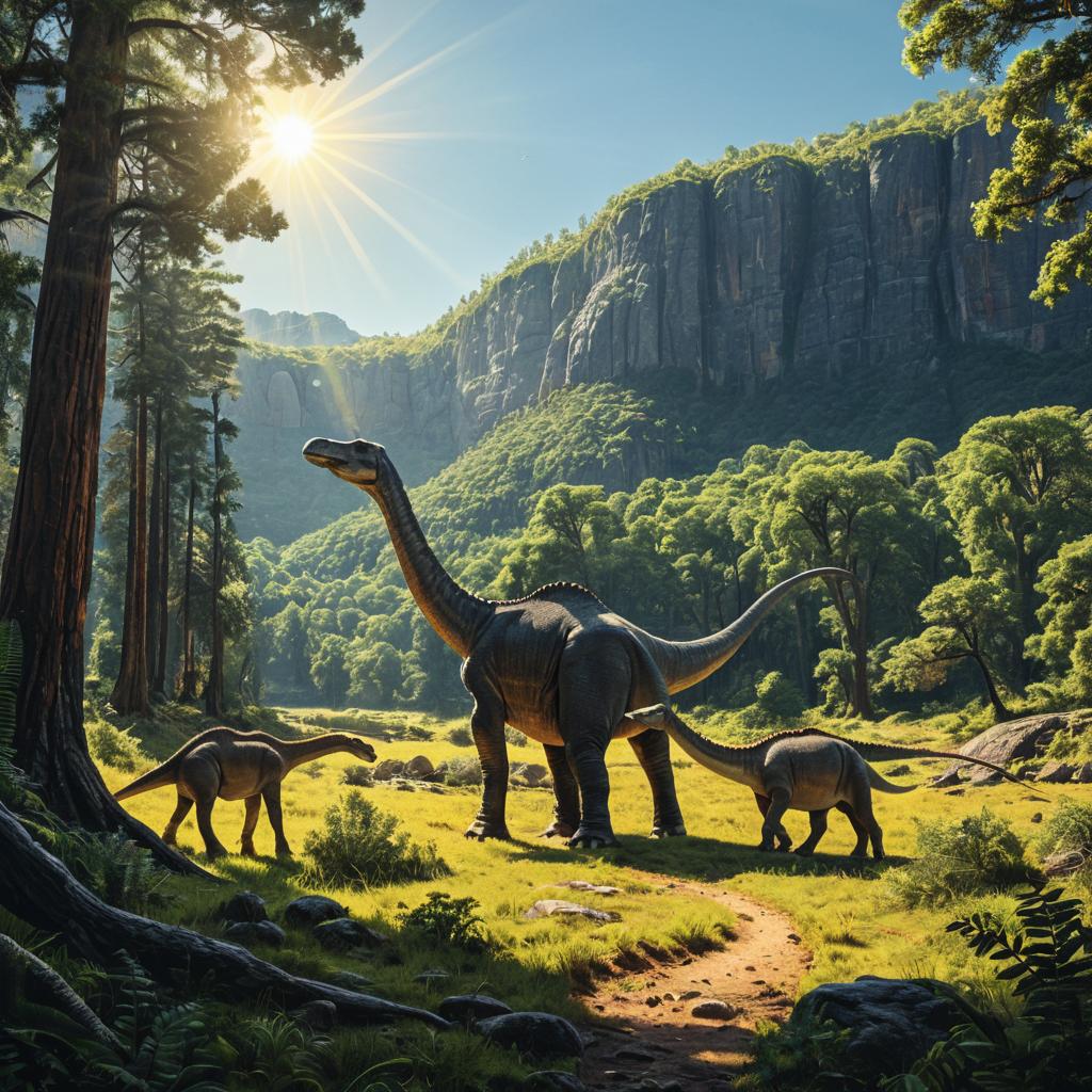 Paleoart illustration of Diplodocus and calves, set in an expansive and breathtaking prehistoric forested valley. The sun shines bright and warm.