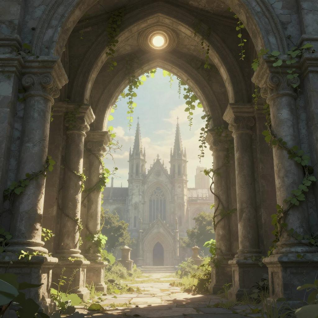 This digital artwork shows a weathered, archway entrance covered in creeping green vines. Sunlight filters through the arch, highlighting the detailed stone columns and the circular, glowing light in the center. Beyond the arch, a distant, gothic-style building with tall spires is visible, bathed in soft, ethereal light. The scene has a magical, slightly abandoned feel, with textures emphasizing decay and nature reclaiming the structure.