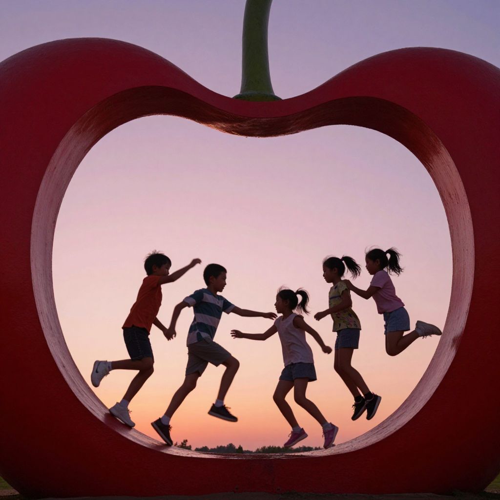Photograph of five silhouetted children of various ages and genders, jumping joyfully inside a large, heart-shaped apple sculpture against a sunset sky. The children's silhouettes are dark, showing varied poses with arms and legs in motion. The apple sculpture is red with a green stem, and the background sky transitions from pink to purple. The children, dressed in casual summer clothes, create a dynamic contrast against the serene, colorful sunset. The apple's texture appears smooth, and the silhouette effect emphasizes their playful movement.