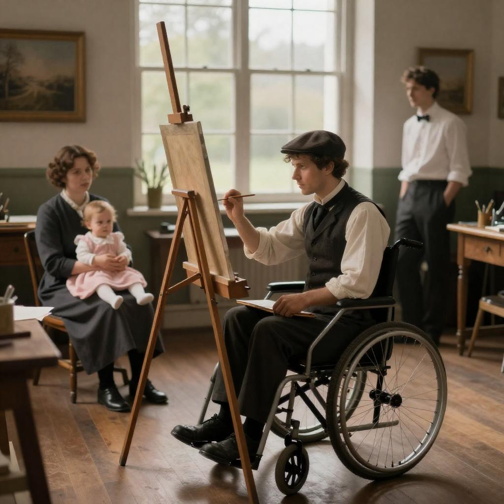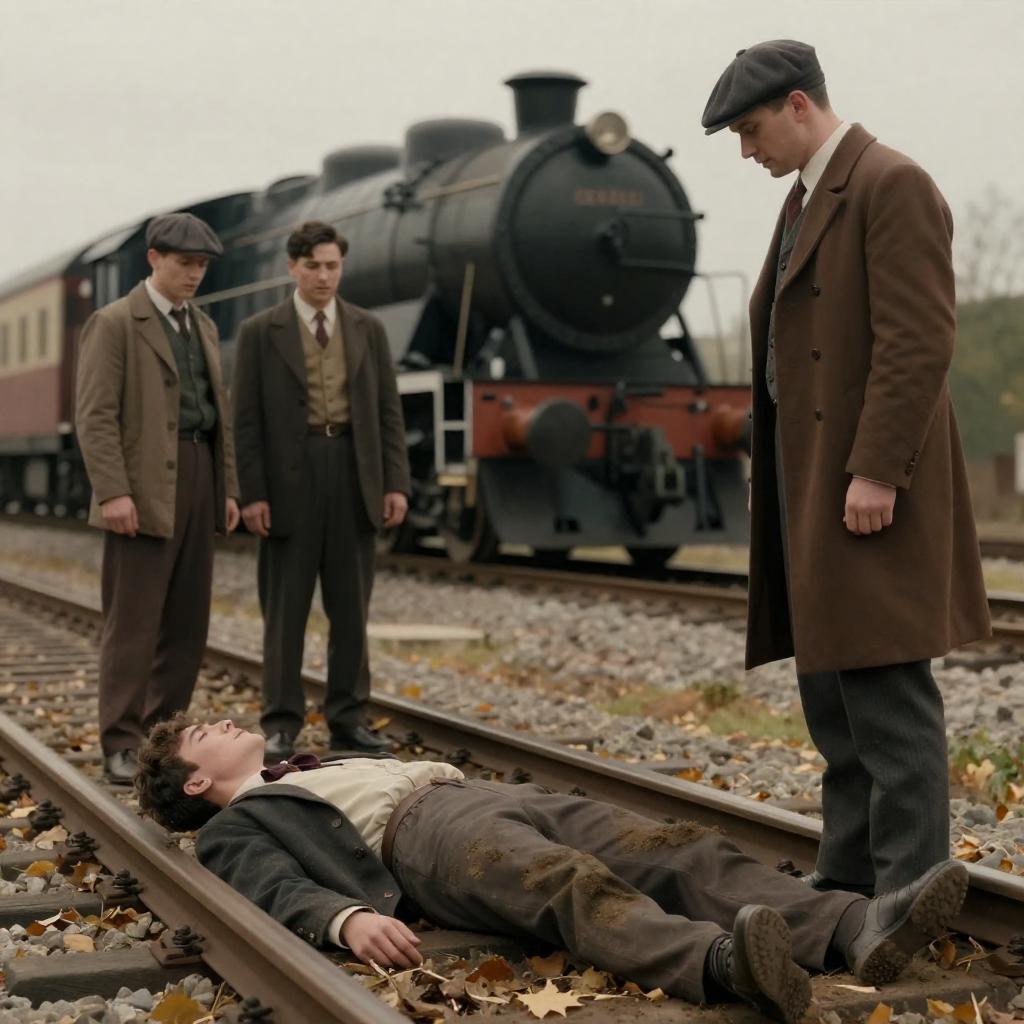 Illustration of a forest scene with six people carrying a stretcher with a covered body across a stream. People wear 19th-century clothing, including dresses and suits. Dense foliage surrounds them. One person holds a hat. Stretcher bearers have focused expressions. Stream reflects trees. Ground covered in leaves.