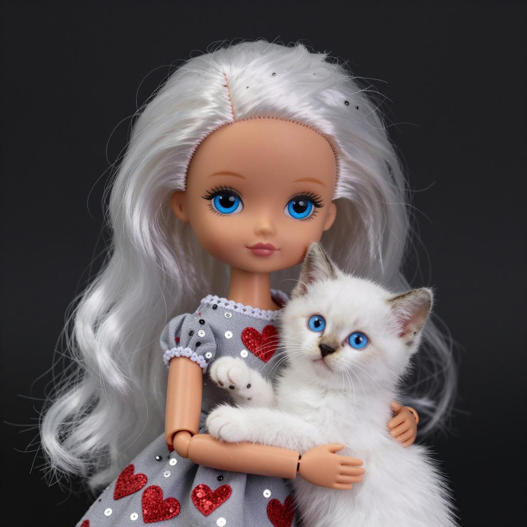 Doll with light brown skin, blue eyes, and white, wild hair holds a white kitten with blue eyes. Doll wears a grey dress with red heart patterns and silver sequins. Kitten's left paw is raised. Black background. Doll's expression is neutral. Doll's right arm wraps around the kitten's back.