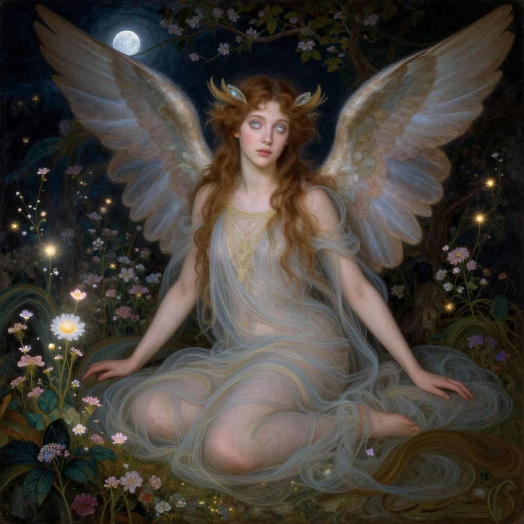 A mesmerizing portrait in the style of Pre-Raphaelite art portrays an enigmatic being with wings spanning gracefully, blending human and avian traits. The subject's eyes gleam like precious stones, conveying a fusion of knowledge and awe. From an elevated viewpoint, we observe this captivating creature sitting elegantly among a garden of glowing blossoms, its gossamer feathers dancing in the gentle moonlight. This dreamlike tableau, invoking a sense of both bewilderment and contemplation, beckons the viewer to marvel at the intricacies of nature's celestial handiwork.