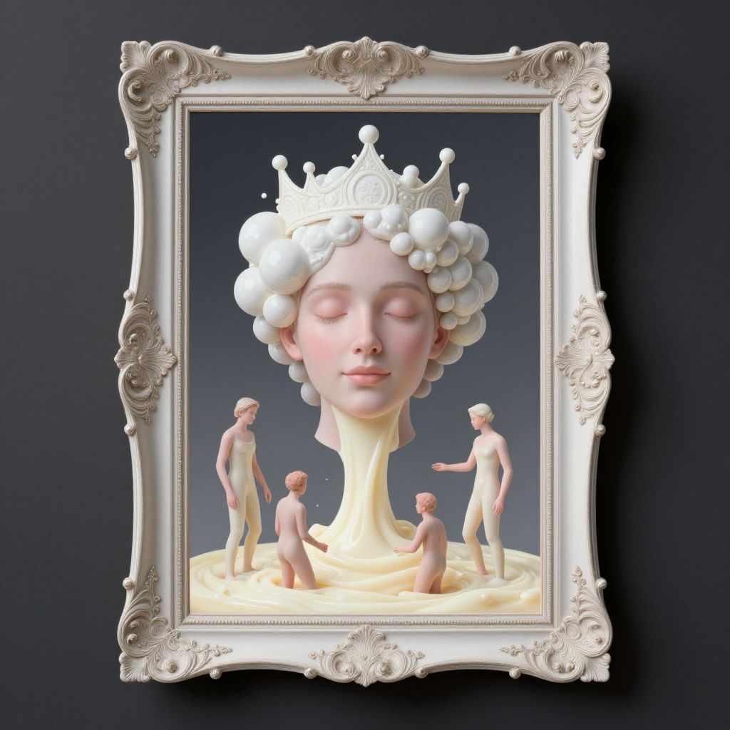 The image presents a surreal and intricate scene with a high level of detail and a pastel color palette. At the center, a large, ornate frame encloses a surreal tableau. Within the frame, a woman's head is depicted, adorned with a crown of white, bubble-like structures. Her expression is serene, with closed eyes and a slight smile. Below her head, a cream-colored pudding-like substance flows, containing several small, human-like figures. These figures appear to be emerging from the pudding, adding a sense of depth and complexity to the scene. The background is a gradient of dark and light shades, creating a dramatic contrast with the light-colored elements in the foreground. The overall composition is balanced, with the frame and the woman's head serving as focal points, while the pudding and the figures provide a dynamic interplay of shapes and textures. The scene evokes a sense of mystery and wonder, with the interplay of the woman's serene expression and the surreal elements of the pudding and figures.