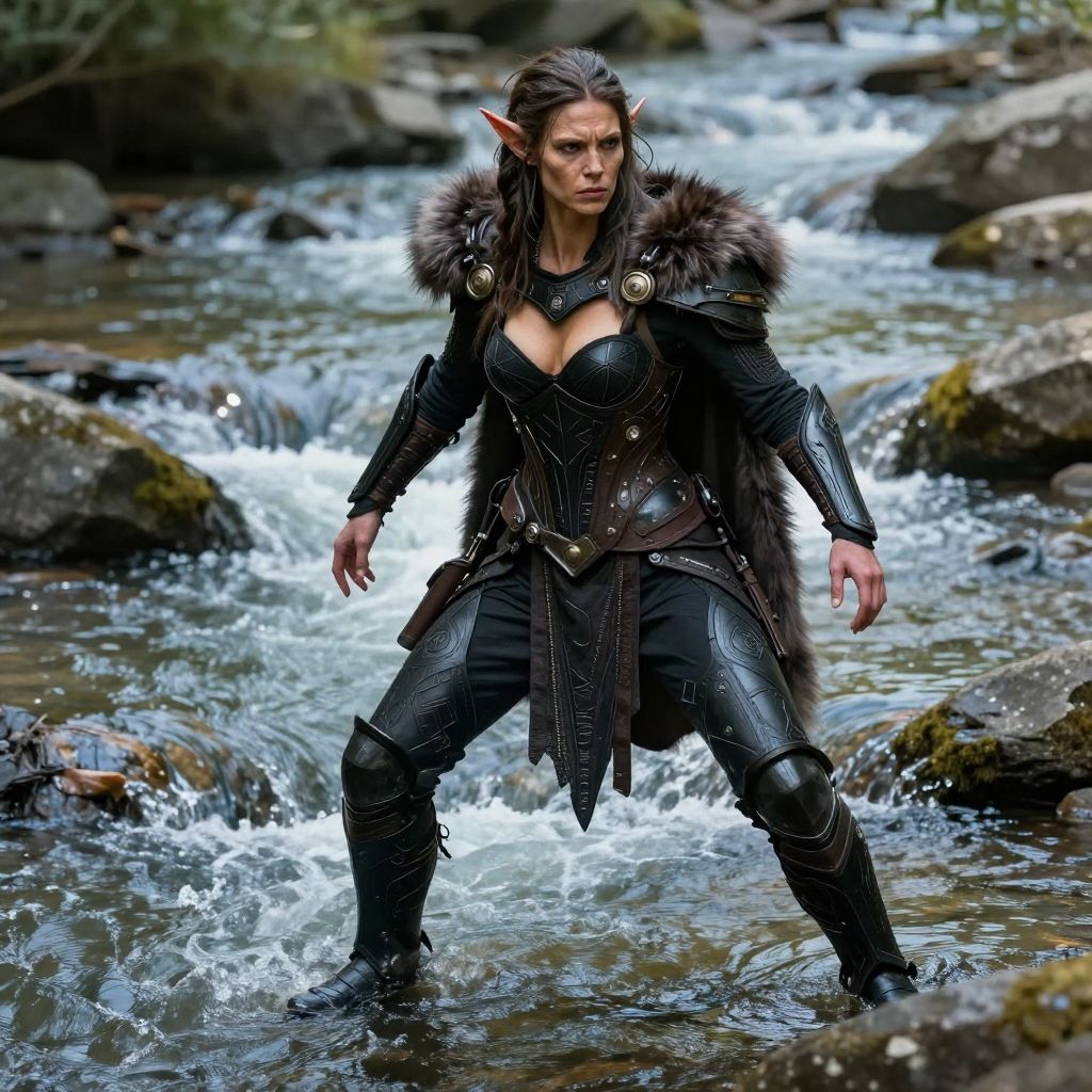 A digitally rendered image of a fierce, dark-haired elf woman standing in a flowing stream. She has pointed ears, intense eyes, and wears a black, armored outfit with a fur-trimmed cape. Her outfit features intricate patterns and a low-cut top revealing ample cleavage. She stands with legs apart, hands clenched, and water splashes around her boots. The background includes rocky stream banks and greenery, adding a natural, forest-like setting. The image has a realistic yet slightly stylized fantasy art style, emphasizing her powerful and warrior-like presence.